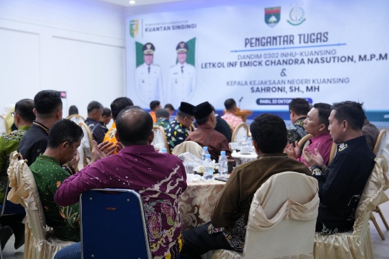TELUK KUANTAN — Rabu malam (22/10/2025) suasana haru bercampur keakraban mewarnai acara Pengantar Tugas Dandim 0302/Inhu-Kuansing Letkol Inf Emick Chandra Nasution, M.P.M dan Kajari Kuantan Singingi (Kuansing) Sahroni, S.H., M.H., yang digelar di Pendopo Rumah Dinas Bupati Kuantan Singingi.