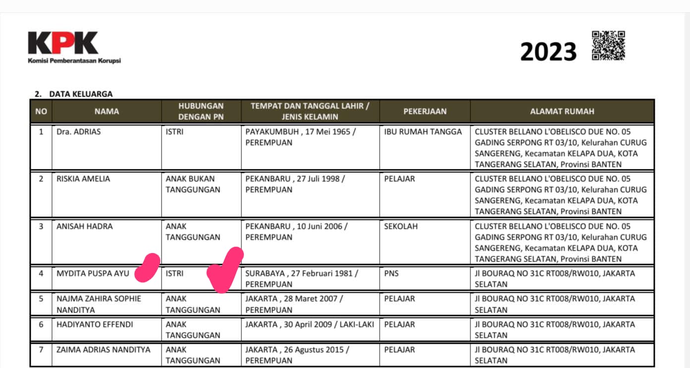 Dokumen resmi LHKPN tersebut mencantumkan dua nama dengan status “istri” atas nama SF Hariyanto. Istri pertama, Dra. Adriyas, tercatat sebagai anggota DPRD Provinsi Riau dari Partai Kebangkitan Bangsa (PKB). Sementara nama lain, Mydita Puspa Ayu, tercantum dengan status istri, berprofesi sebagai PNS dan disebut sebagai pegawai KPU Kota Bekasi, dengan alamat berbeda.