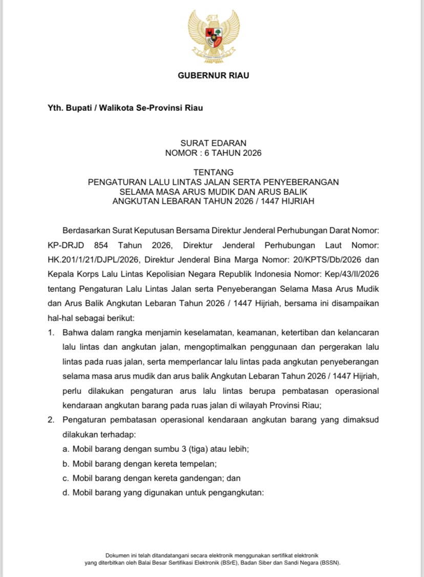 Kuansing – Pemerintah Provinsi Riau resmi mengeluarkan Surat Edaran Nomor 6 Tahun 2026 tentang pengaturan lalu lintas jalan serta penyeberangan selama masa arus mudik dan arus balik Lebaran 1447 Hijriah. Aturan ini diteken oleh Plt Gubernur Riau, S. F Hariyanto sebagai langkah menjaga keamanan dan kelancaran arus kendaraan di jalan raya.