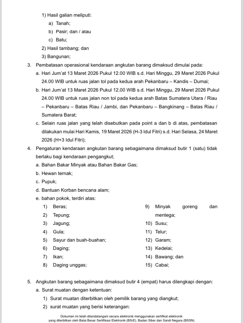 Dalam surat edaran tersebut ditegaskan adanya pembatasan operasional kendaraan angkutan barang, khususnya kendaraan dengan sumbu tiga atau lebih, kendaraan dengan kereta tempelan, serta kereta gandengan. Pembatasan ini berlaku di sejumlah ruas jalan strategis di Provinsi Riau.