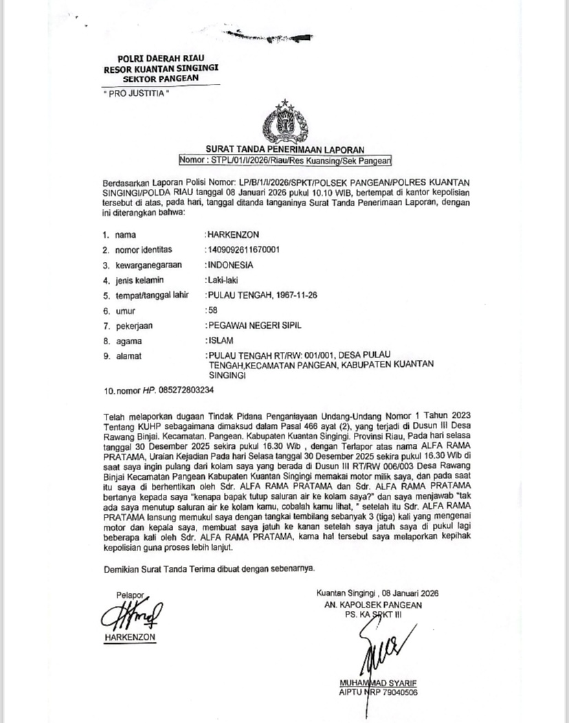 Laporan tersebut tertuang dalam Surat Tanda Penerimaan Laporan (STPL) bernomor STPL/01/I/2026/Riau/Res Kuansing/Sek Pangean, terkait insiden yang terjadi di Dusun III Desa Rawang Binjai, Kecamatan Pangean, Selasa malam, 30 Desember 2025 lalu.