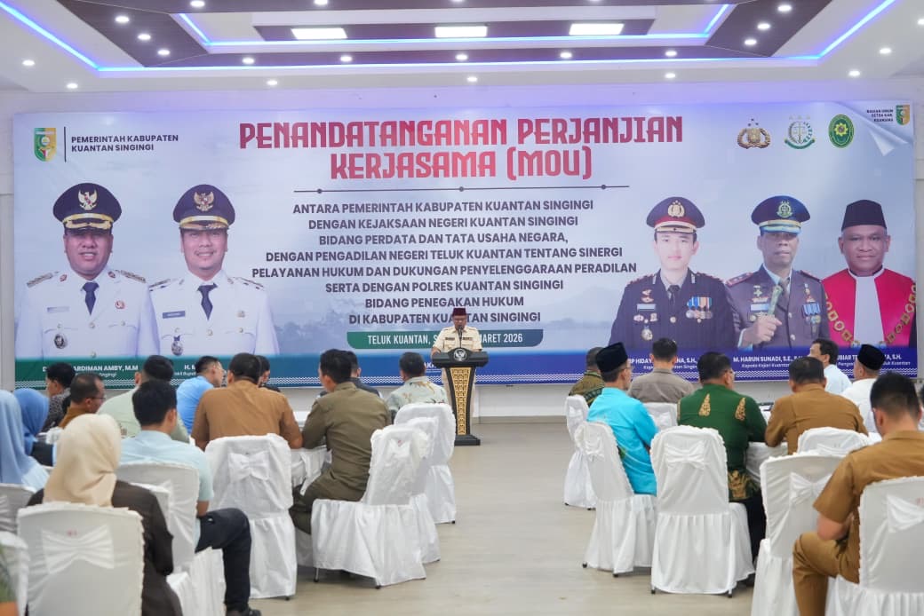 Teluk Kuantan – Komitmen penguatan tata kelola pemerintahan dan optimalisasi Pendapatan Asli Daerah (PAD) di Kabupaten Kuantan Singingi semakin diperkuat melalui sinergi lintas lembaga. Dalam kegiatan yang digelar di Pendopo Rumah Dinas Bupati, Selasa (3/3/2026),